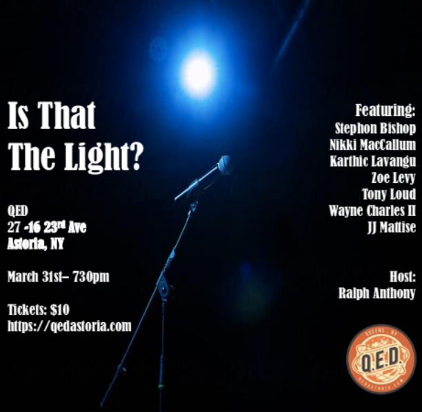 “Is that the Light,” is a New York City based live stand up comedy show produced in the heart of Astoria at QED. It’s hosted by Ralph Anthony, and features some of the top comedians from all over the country. They’ve been featured on the late night TV, Netflix, Amazon Prime, the NY Comedy Festival, and JFL to name a few. Audiences will be in for a fun time and guaranteed laughs so come out and enjoy the show.