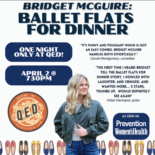 • Using A mix of stand-up and storytelling, “Ballet Flats for dinner” tells the story of McGuire's life growing up with intrusive thoughts with harm, a form of OCD.   From thinking she was pregnant at age 11, to wondering if she killed her friend's boyfriend at 25, to finally getting help at the ripe old age of 38, Ballet Flats will have you laughing the entire time and perhaps you'll walk away wondering, "Do I have OCD too?" (Don't worry, you probably don't).