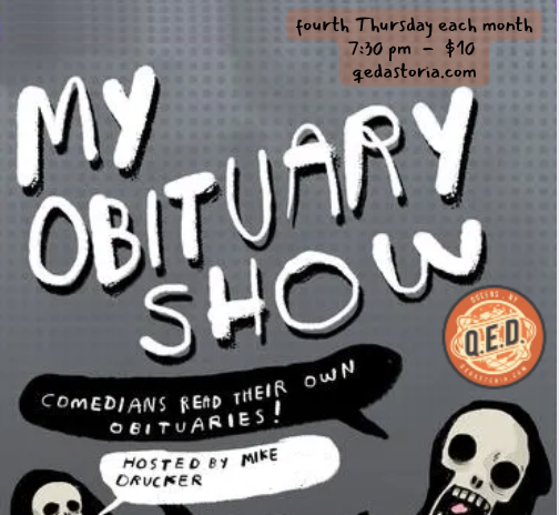 • On "My Obituary Show", writers and comedians read their own obituaries, honoring the lives they had and making fun of the lives they could have had. Hosted by Mike Drucker (Full Frontal With Samantha Bee, The Tonight Show, Late Night with Seth Meyers). Join the party on the fourth Thursday of each month at 7:30!